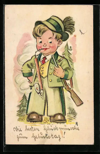 Künstler-AK kleiner rauchender Jäger betrachtet stolz sein Gewehr