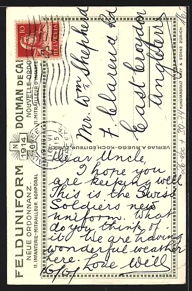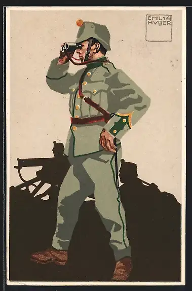 Künstler-AK sign. Emil Huber: schweizer Infanterie-Mitrailleur-Korporal in Uniform mit Fernglas, MG-Trupp