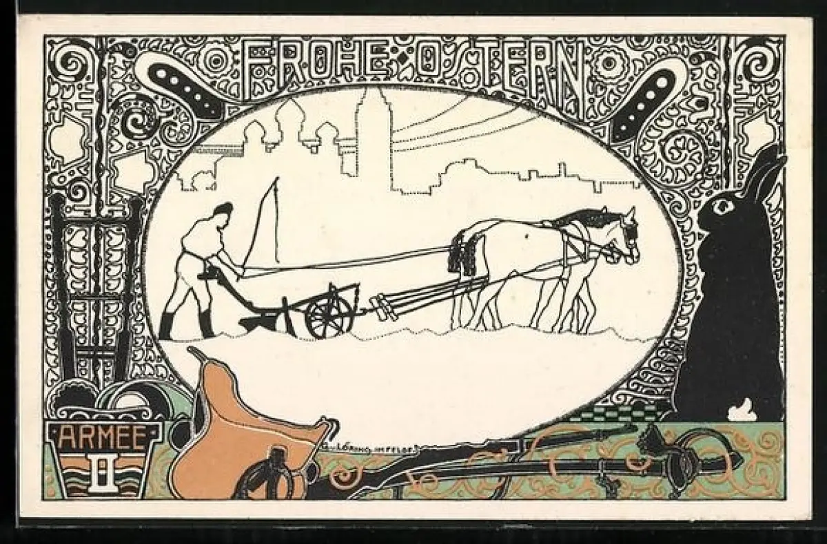 Künstler-AK sign. G. v. Löring: Ungarische Werkstätte, Bauer mit Pflug, Osterhase, II. Armee, Jugendstil