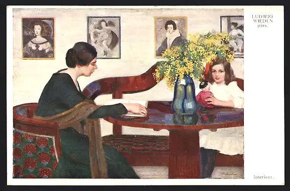 Künstler-AK sign. Ludwig Wieden: Mutter mit Tochter am Stubentisch