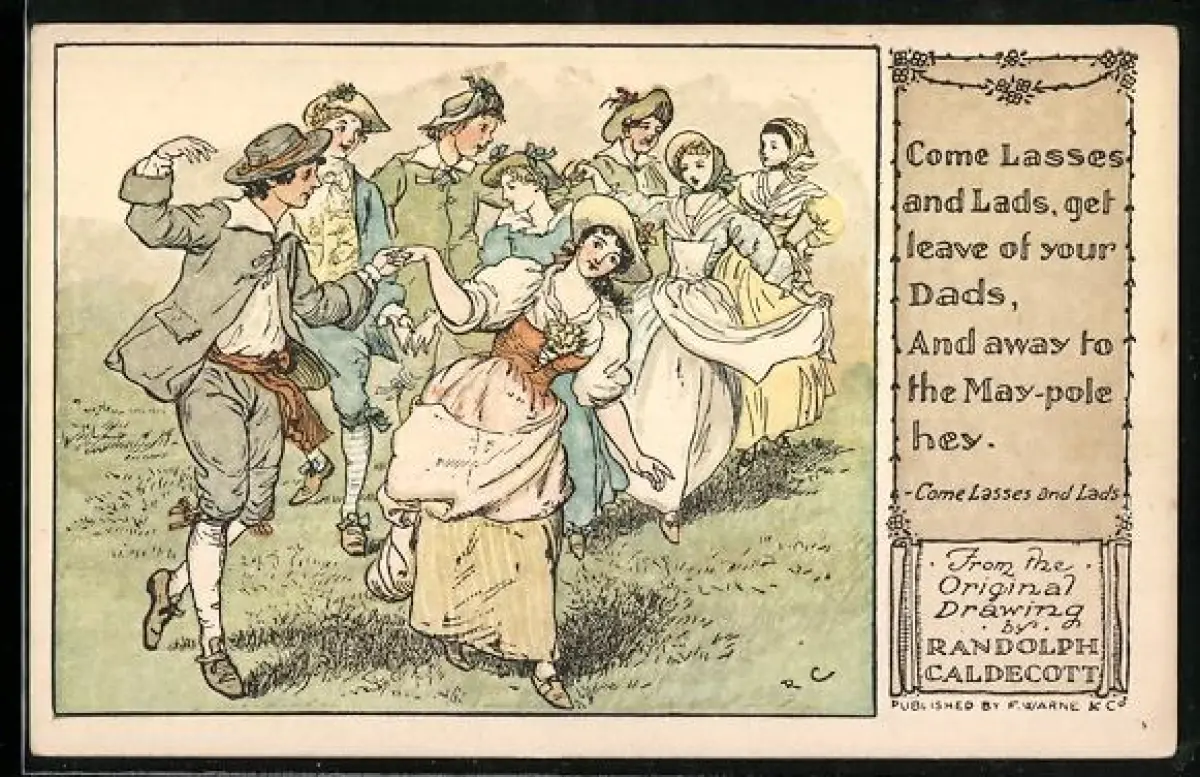 Künstler-AK sign. Randolph Caldecott: Junge Paare tanzen auf einer Wiese