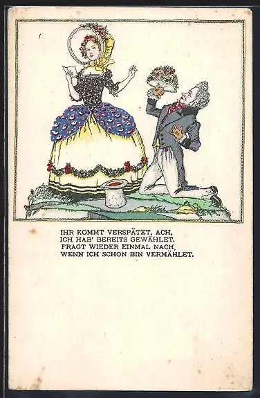 Künstler-AK sign. Robert Philippi: Gentleman liegt einer Dame zu Füssen, Vers