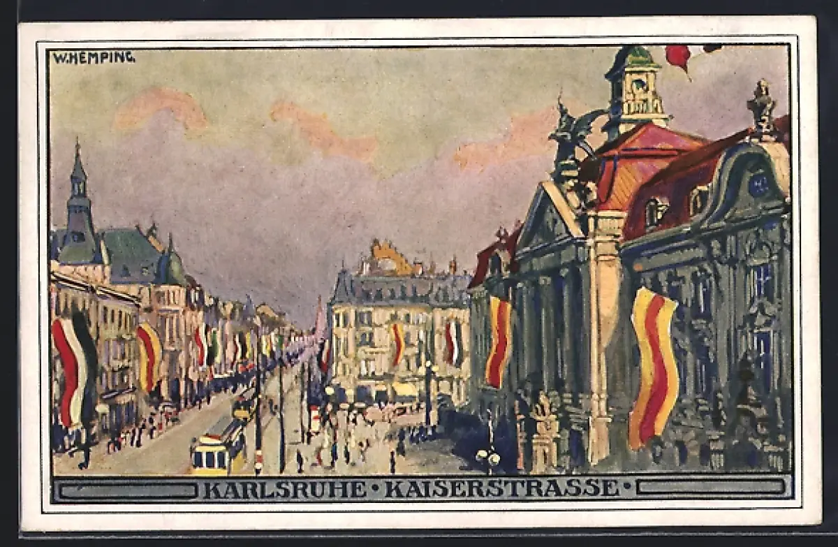 Künstler-AK sign. W. Hempfing: Karlsruhe, Kaiserstrasse mit Strassenbahnen