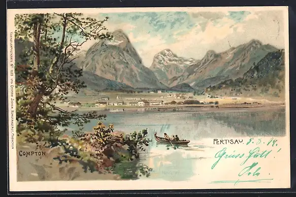 Künstler-Lithographie Edward Theodore Compton: Pertisau, Fernsicht der Ortschaft, Ruderboot