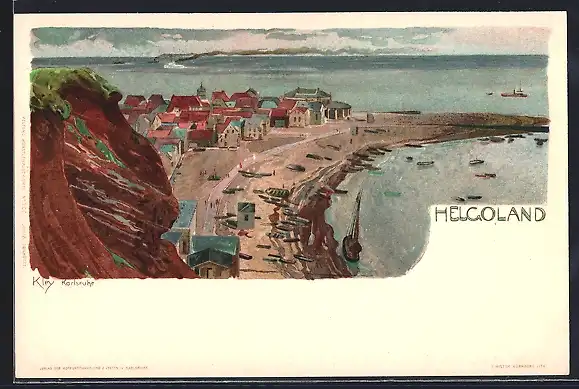 Künstler-Lithographie Heinrich Kley: Helgoland, Strandpartie aus der Vogelschau, Segelboot