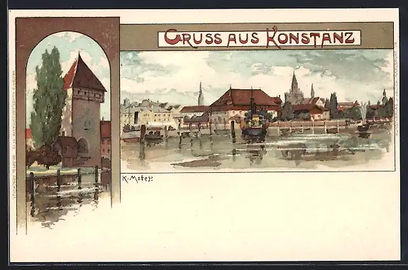 Künstler-Lithographie K. Mutter: Konstanz, Ortsansicht vom Bodensee aus, Wehrturm