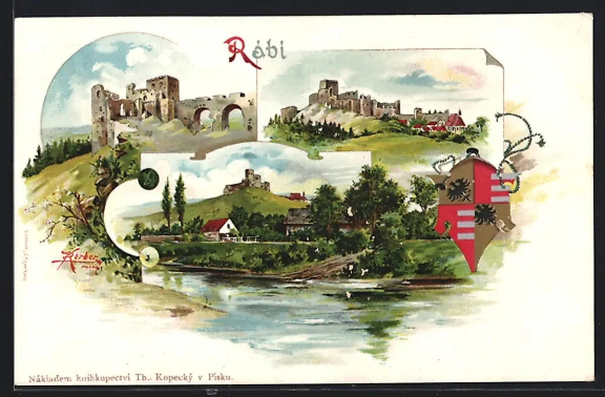 Künstler-Lithographie Rábi, Burgruine, Ortschaft mit der Ruine, Wappen