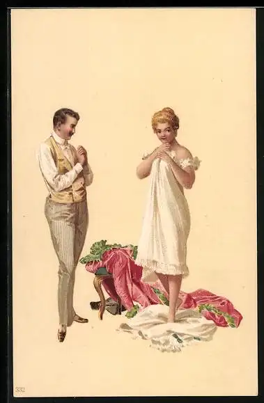 Künstler-Lithographie Richard Hegedüs-Geiger: blonde Frau steht in Unterwäsche vor ihrem Geliebten