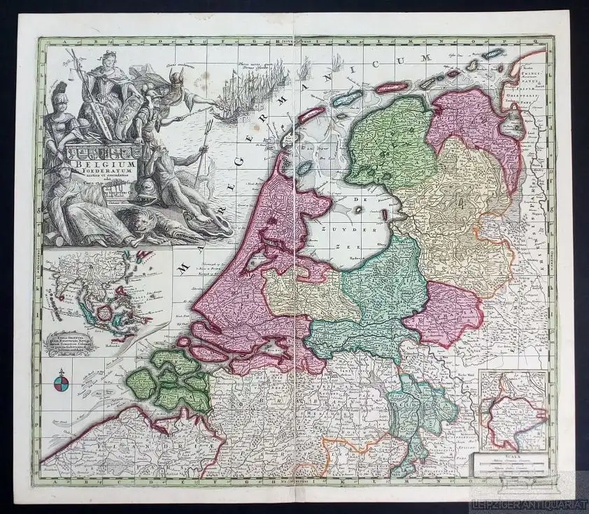 Bemerkungen: Zustand: Blatt leicht fleckig und altersbedingt minimal gebräunt, Kupferstich gebräunt, im oberen Rand etwas braunfleckig, Ecken wenig bestoßen // Dekorative figürliche Titelkartusche mit Wappen, Original altkolorierte Kupferstichkarte. Kunstgrafik. Druckgröße: 58,5 x 51 cm, Hier dabei zweites Blatt (51 x 63 cm) mit: Alpabetischer Index. Worinnen angezeigt wird / wie alle die jenige Orte und Wörter so in der von Matthaei Seutter / über das Königreich Dänemark gestochen particular Land=Karten gedruckter seynd / also gleich gefunden werden können, Zeigt Dänemark, Schleswig-Holstein und Südschweden