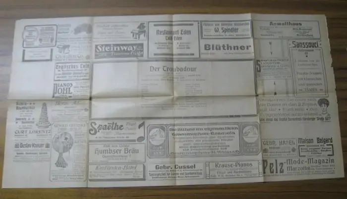 Titel: Der Troubadour. Programmzettel. Oper in vier Akten. Regie: Carl Struwe. Musikalische Leitung: Robert Heumann. Darsteller: Gustav Kirchberg, Margarete König, Paula Weber, Johannes Reinhardt, Hans Thomascheck, Elli Ventori, Walter Damm, Josef Hertzka, Hermann Ploetz