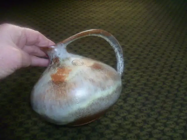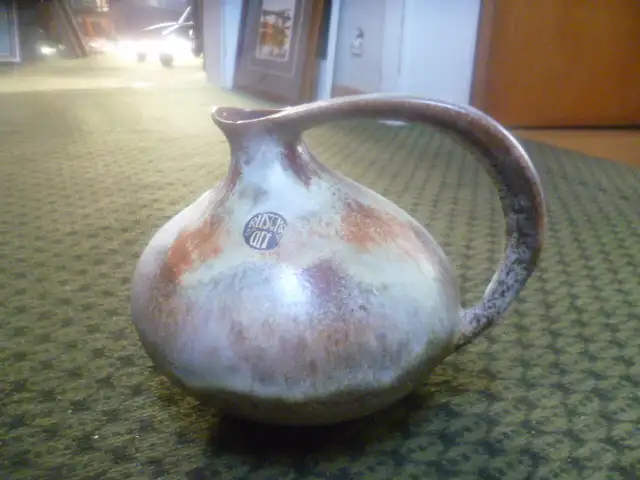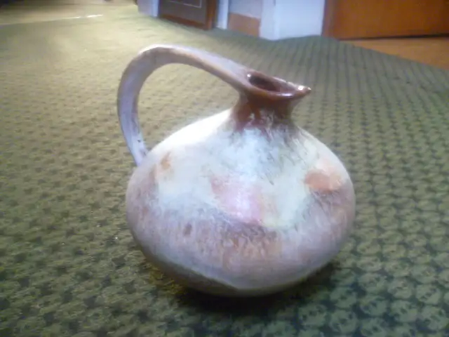 Diese Vase ist eine echte Vintage Ikone. Nur wenige andere Keramikobjekte schaffen es, die Gestaltungsideen der 1950er Jahre so schön einzufangen. Der hervorstehende, perfekt geformte Griff wirkt fast unwirklich, futuristisch. Insgesamt wirkt es stromlinienförmig und organisch.