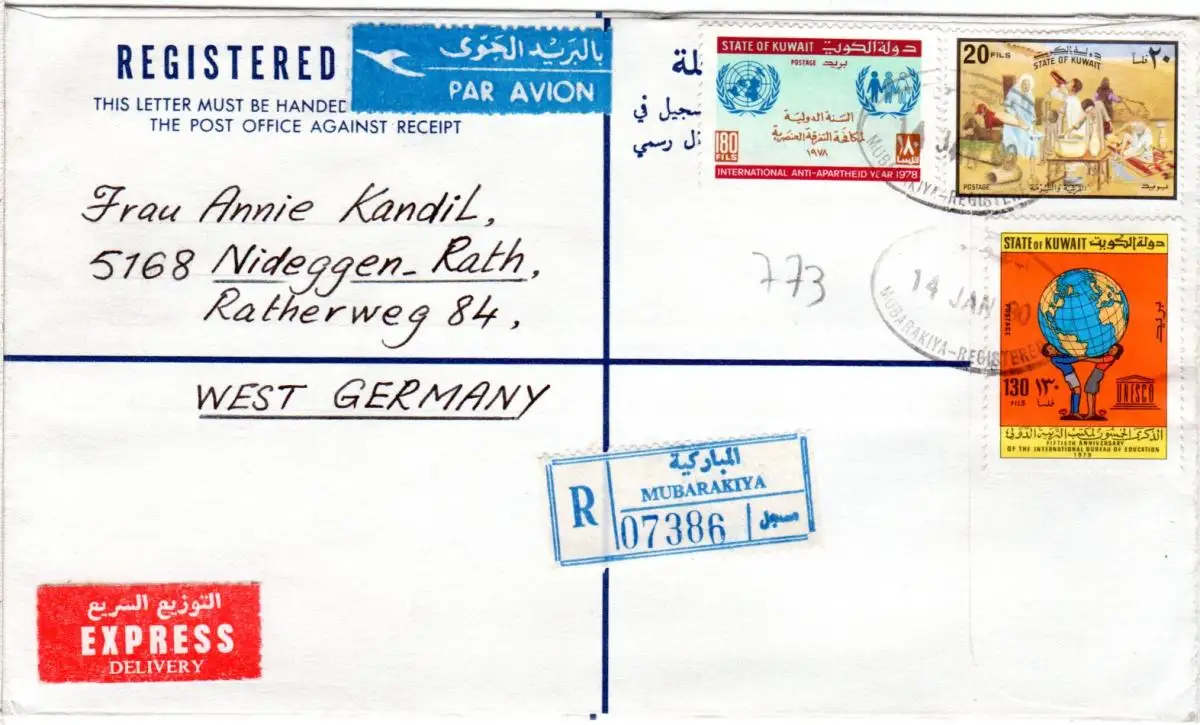 Kuwait 1980, 3 Marken auf Luftpost Einschreiben Express Brief v. Mubarakiya
