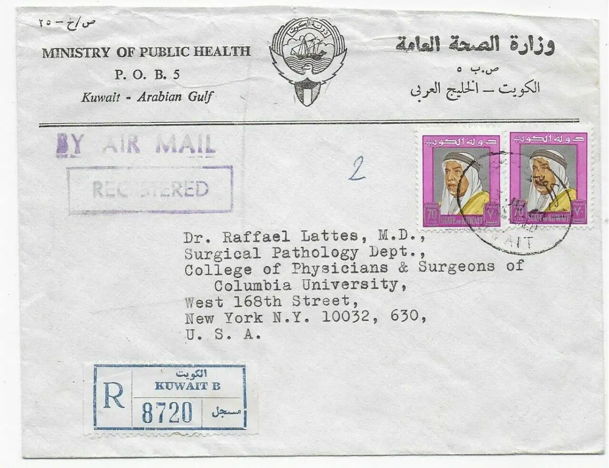 Kuweit: Einschreiben Ministry of Public Health to Columbia University New York