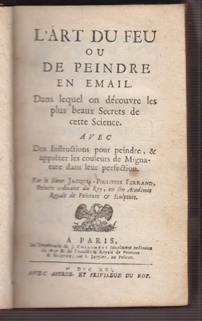 Bemerkungen: Massing 62; vgl. UCBA, I, 548; Benezit II, 273 - Der Autor war Mitglied der `Academie Royale de Peinture et Sculpture`. Sein Text widmet den Pigmenten und Farben der Emailmaler große Aufmerksamkeit.