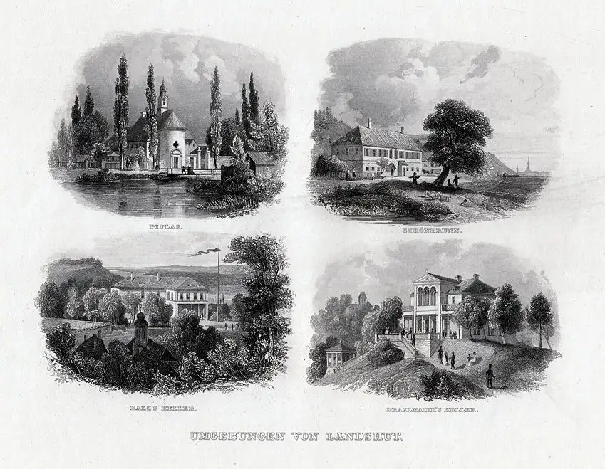 Stahlstich, um 1850. von Meermann ca.11,5 x 16 cm (Darstellung ) Piflas, Schönbrunn, Balz`s Keller, Draxlmaier`s Keller.