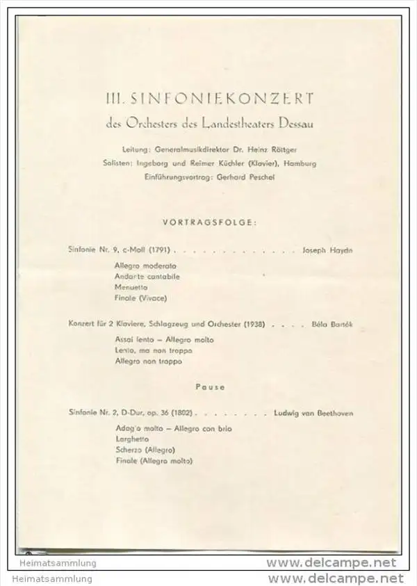 Landestheater Dessau - Spielzeit 1956/57 Nummer 17 - Programmheft III. Sinfoniekonzert - Solisten Ingeborg und Reinmar Küchler Hamburg - Gebrauchsspuren - Heftklammer rostig (EP5308)