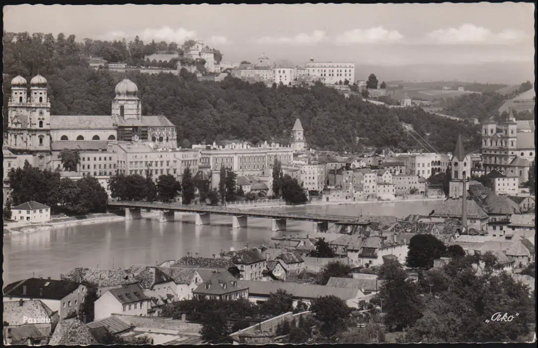 Poststellenstempel auf Ansichtskarte Passau - Blick über Inn und Innstadt zur Altstadt mit Dom und Oberhaus