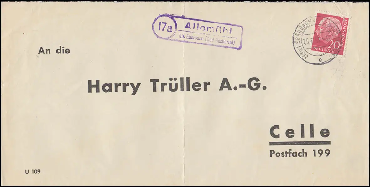Landpost Allemühl über Eberbach 1959 Bedarfserhaltung/senkrechter Briefbug