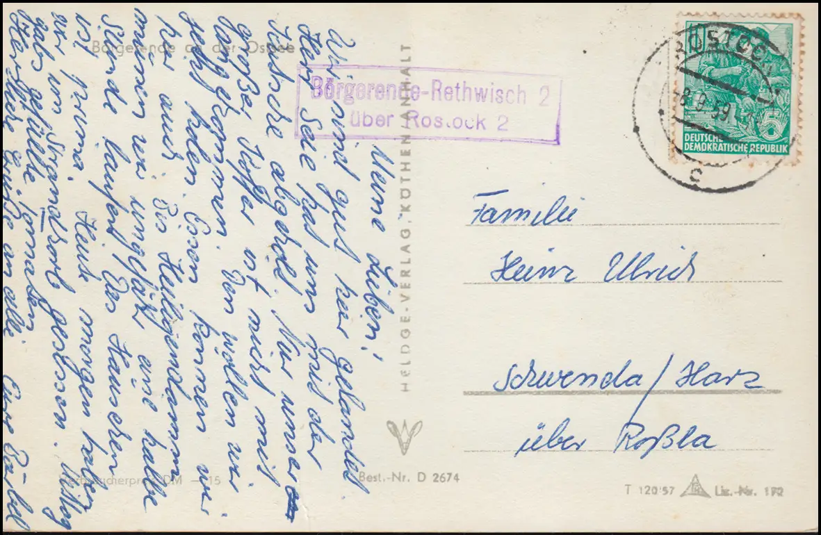 Landpost Börgerende-Rethwisch 2 über ROSTOCK 2 - 8.9.1959 auf passender AK