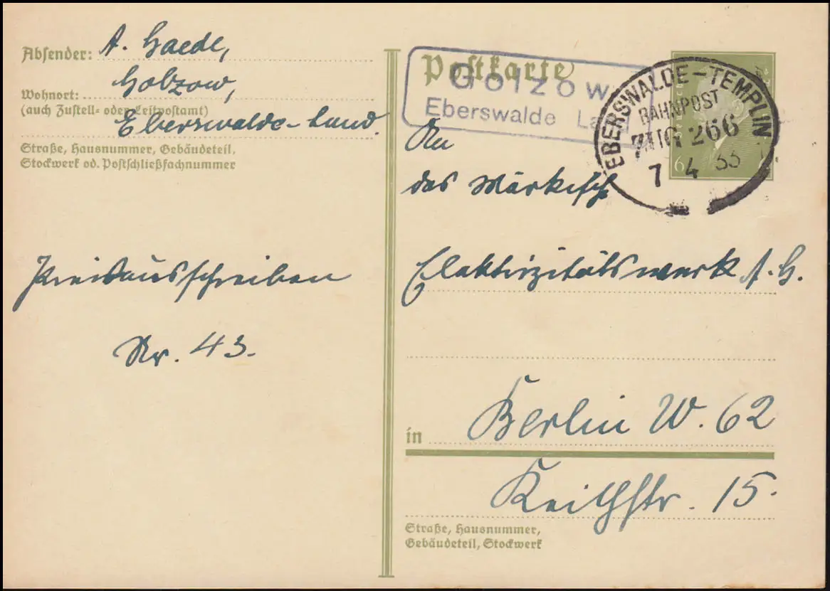 Landpost Golzow Eberswalde Land Bahnpost EBERSWALDE-TEMPLIN ZUG 266 - 7.4.33
