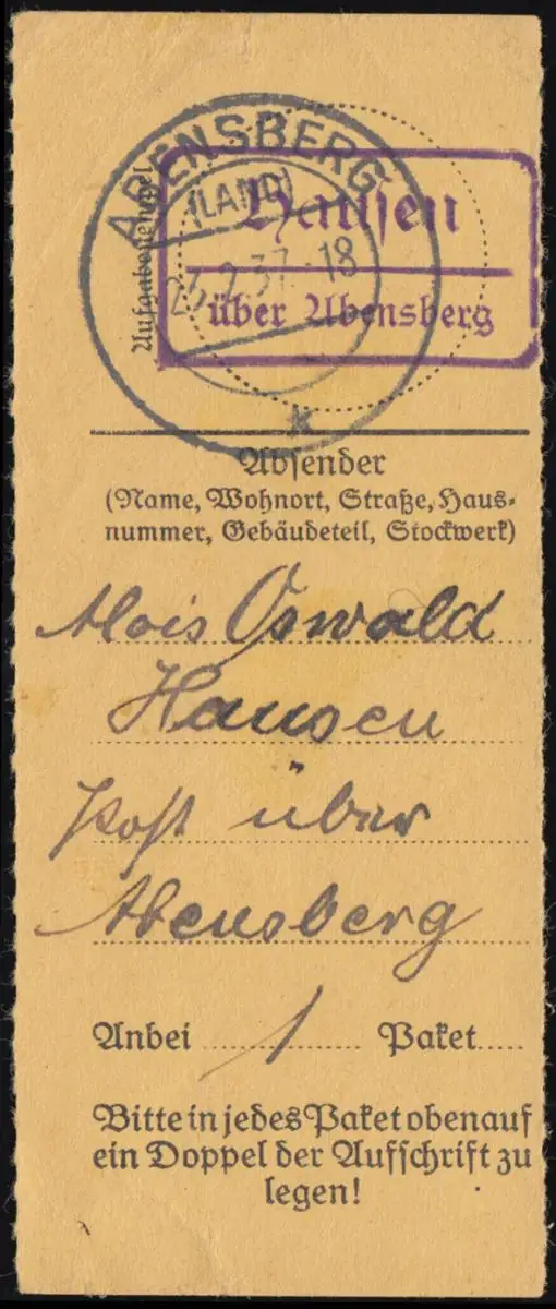 Landpost Hausen über ABENSBERG 23.2.1937 auf Paketkartenabschnitt