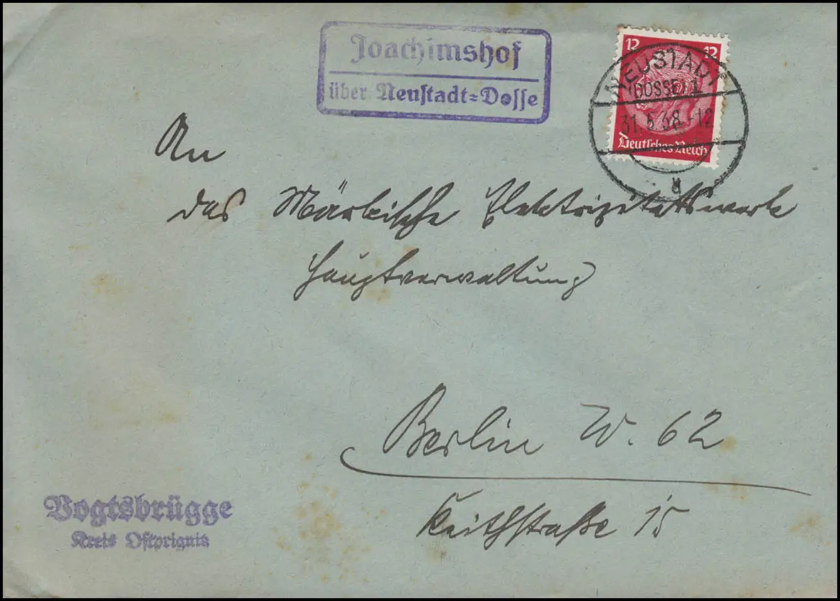 Landpost JOACHIMSHOF über NEUSTADT (Dosse) 31.5.1938 auf Brief nach BERLIN