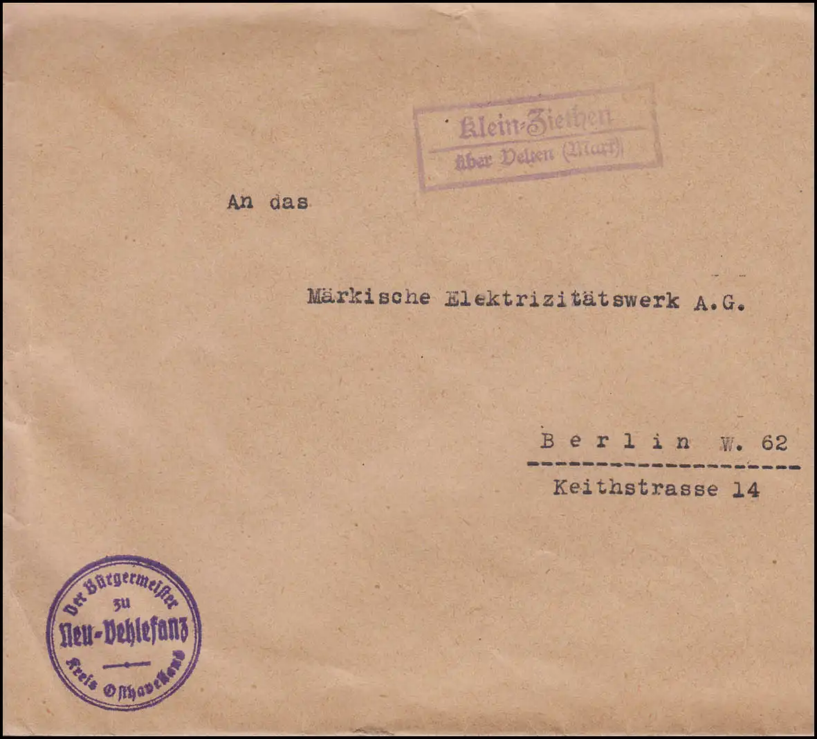 Brief vom Bürgermeister von Neu-Vehlefanz / Kreis Osthavelland.