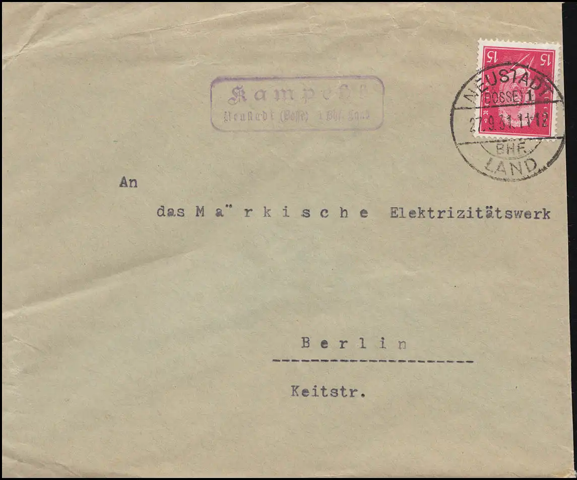 Landpost Kampehl Neustadt Dosse 1 Bhf. Land, Brief NEUSTADT DOSSE 27.9.31