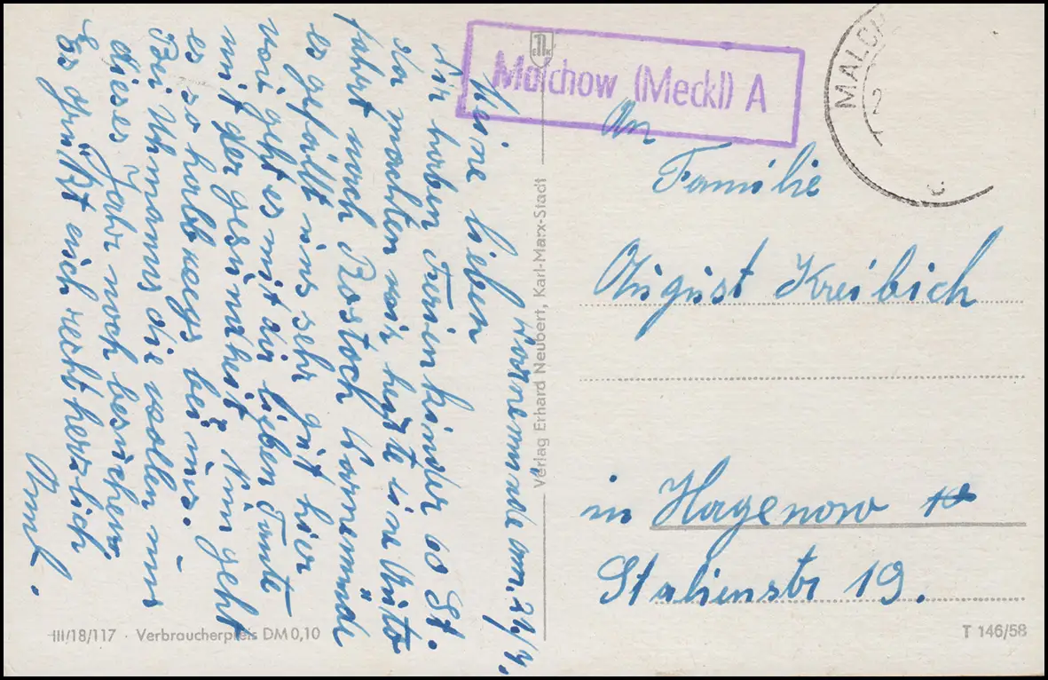 Landpost Malchow (Mecklenburg) A, Stempel MALCHOW um 1960, auf AK Warnemünde