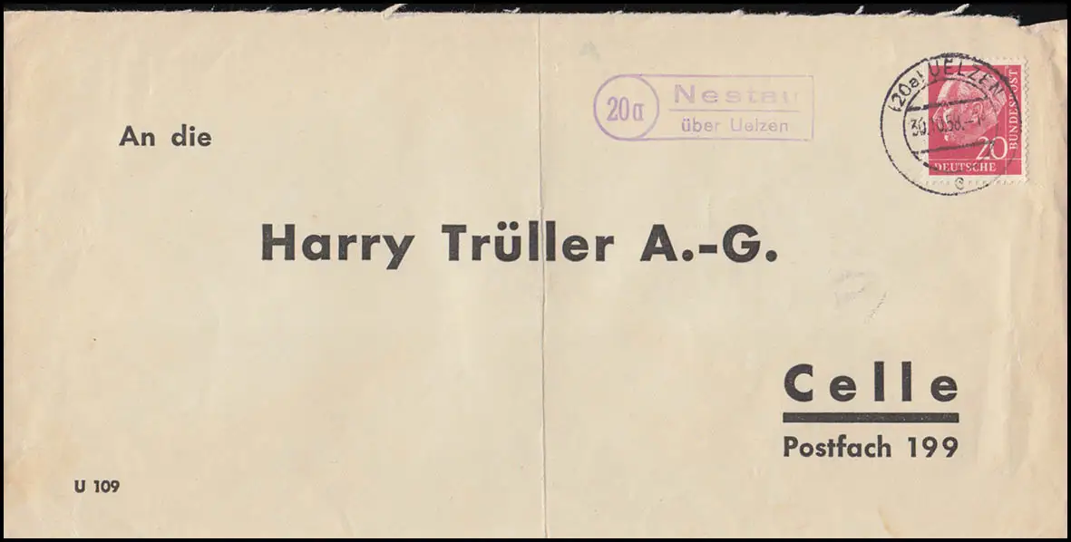 Landpost Nestau über Uelzen 30.10.58 Bedarfserhaltung/senkrechter Briefbug