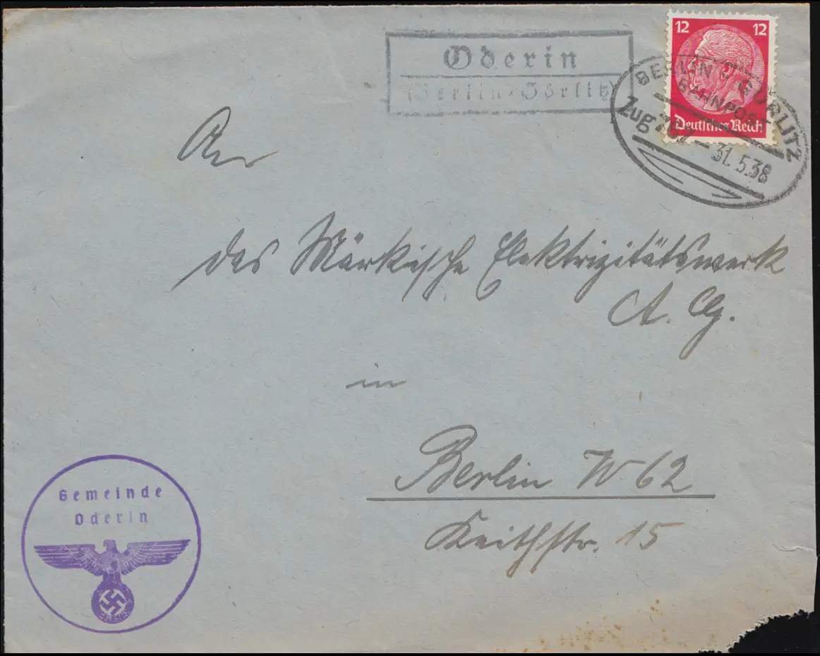 mit Briefstempel Einkreisstempel "Gemeinde Oderin", kleine Briefecke fehlend laut Abbildung