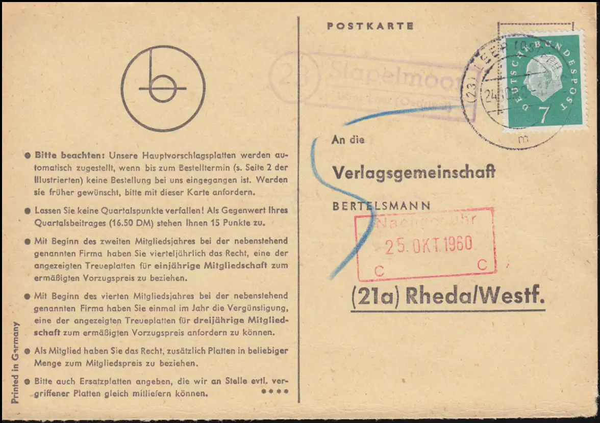 Landpost Stapelmoor über LEER (OSTFRIESL) 24.10.1960 auf Postkarte nach Rheda