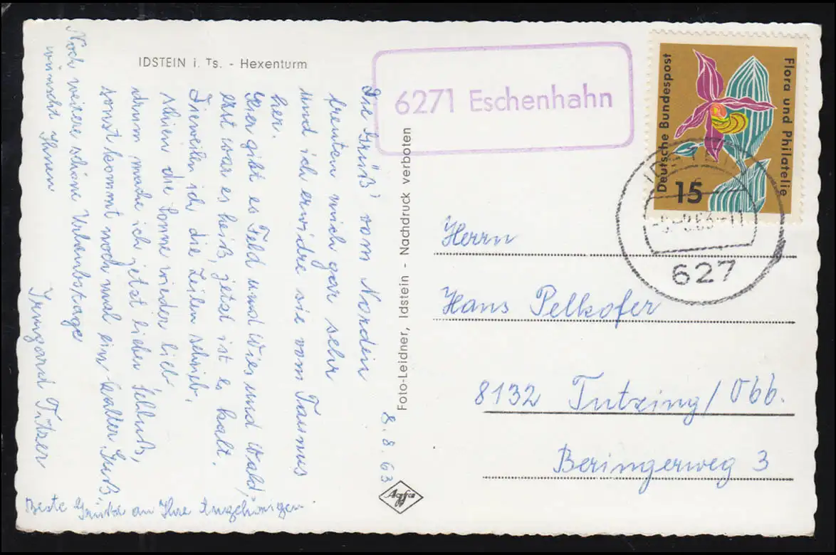 Landpost-Stempel 6271 Eschenhahn auf AK Idstein Hexenturm, IDSTEIN 1963