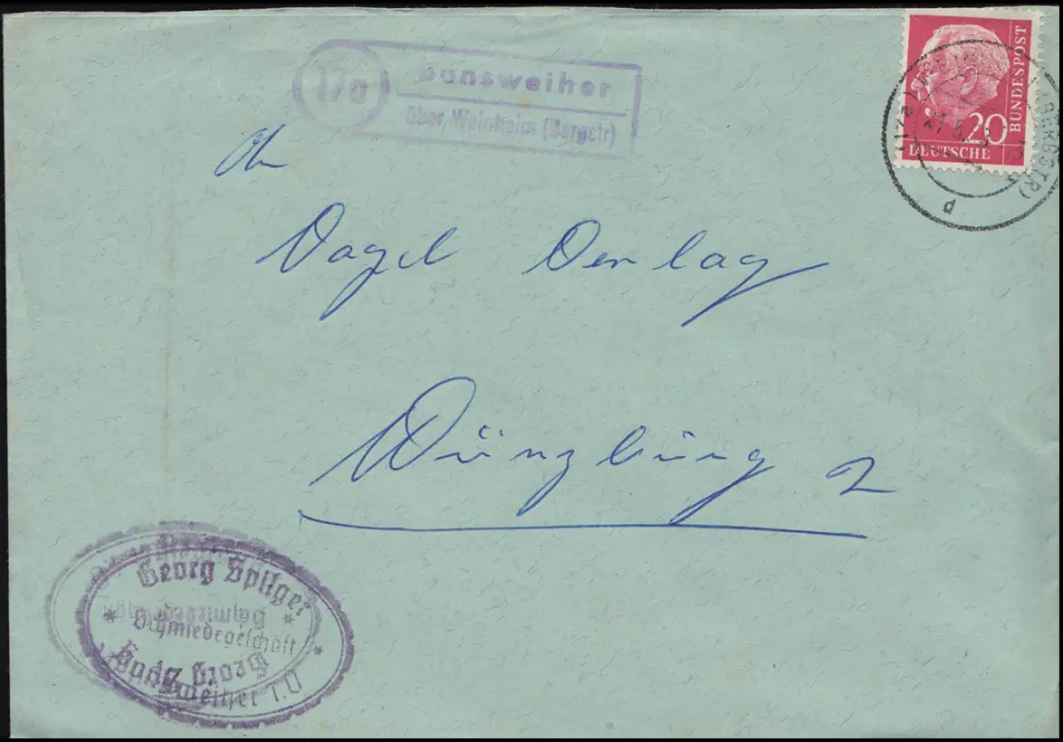 Landpost-Stempel Bonsweiher über WEINHEIM (BERGSTR.) 21.5.1958 auf Brief