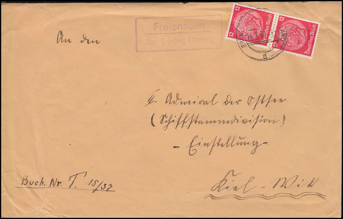 Landpost-Stempel Freienseen über GRÜNBERG (HESSEN) 18.3.1937 nach Kiel-Wik