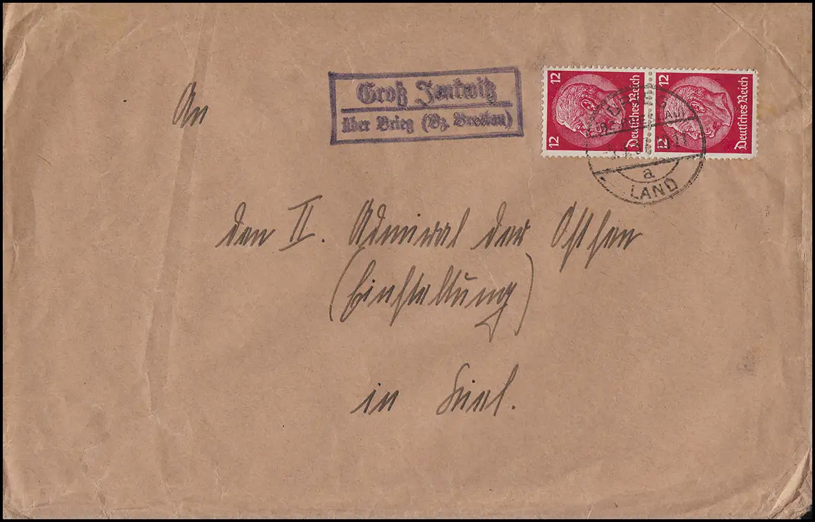 Landpost-Stempel Groß Jenkwitz über BRIEG LAND (BZ. BRESLAU), Brief 3.1.37