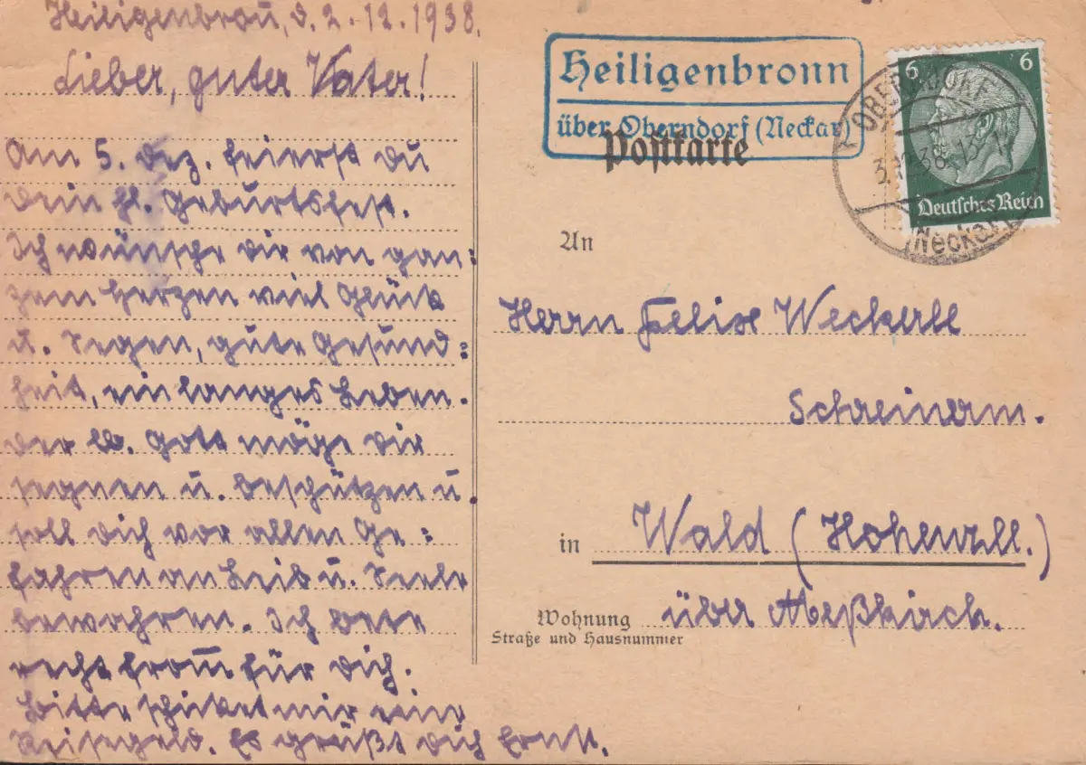 Landpost-Stempel Heiligenbronn über OBERNDORF (NECKAR) 3.12.1938 auf Postkarte