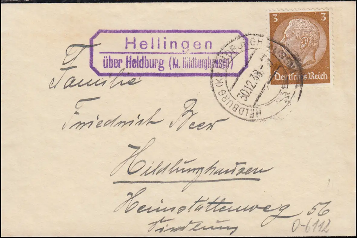 Landpost-Stempel Hellingen über HEIDBURG (Kr. HILDBURGHAUSEN) 30.12.38 auf Brief