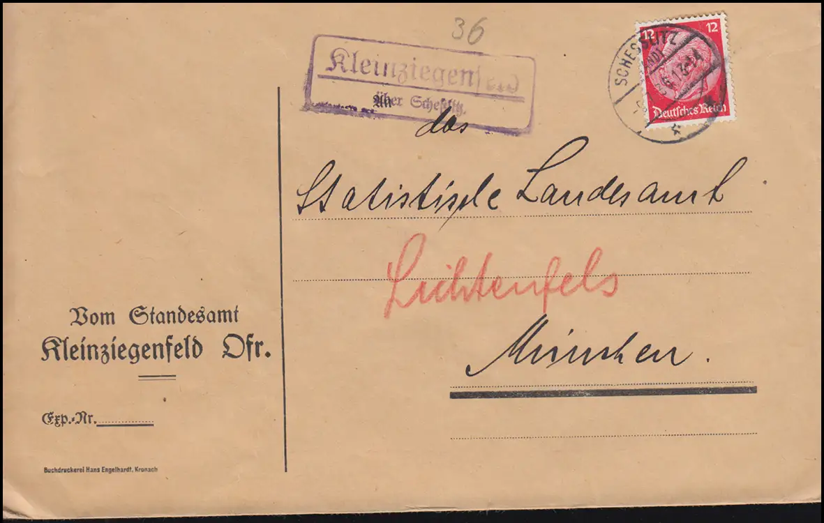 Landpost-Stempel Kleinziegenfeld über SCHESSLITZ (LAND) 6.7.1936 auf Brief