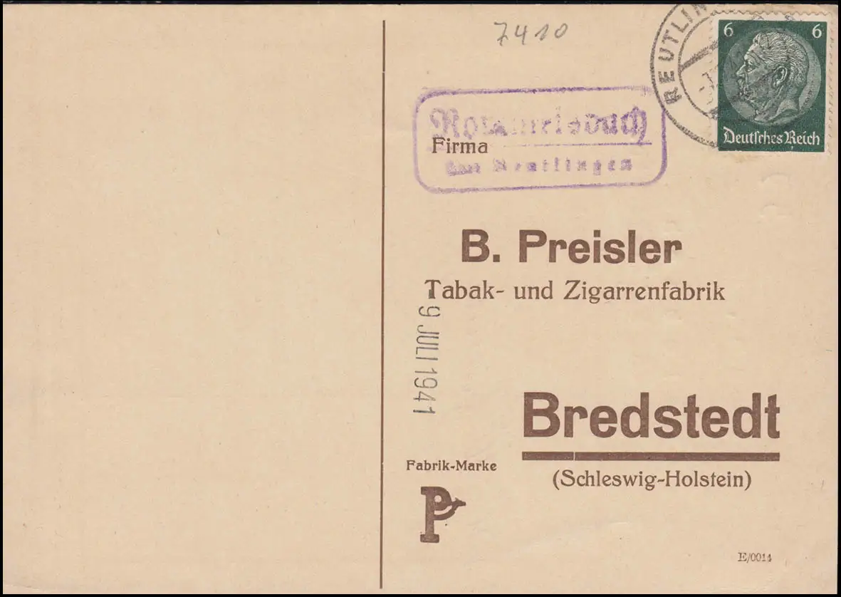 Landpost-Stempel Rommelsbach über REUTLINGEN 7.7.1941 auf Bestell-Postkarte