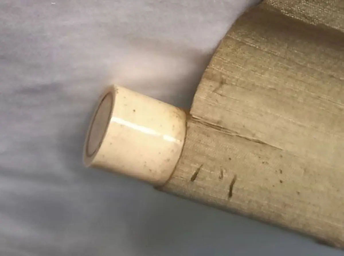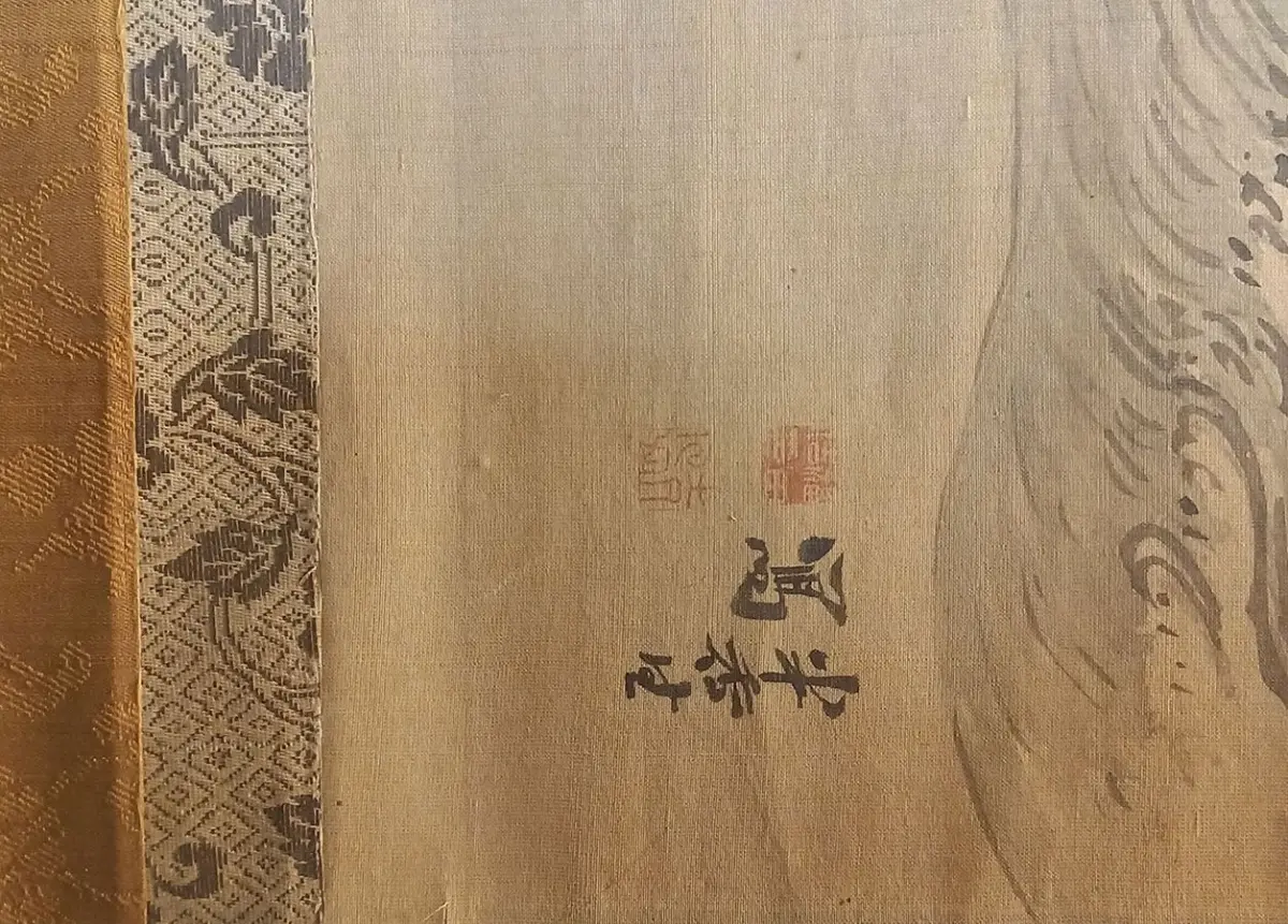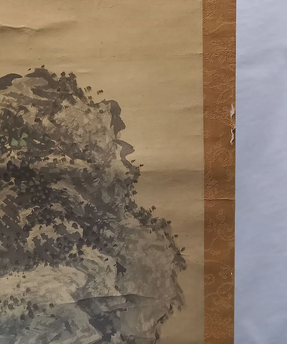 Japan. Antique hanging silk scroll. Bordered with silk and silk brocade. Heigth 77,5". Width 20,4" (ca. 182 x 40 cm). Bone roller ends. Few minor damages on the edges and on the roller.