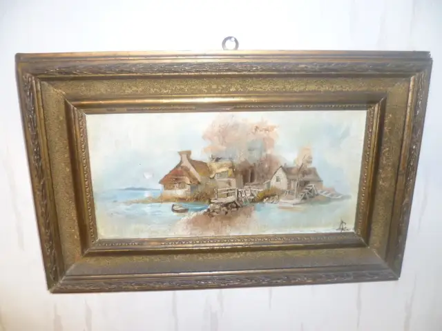 Landschaftsromantiker wohl München um 1870 -90 " Fischerhäuser am Strand oder an einem See , signiert ligiert ?