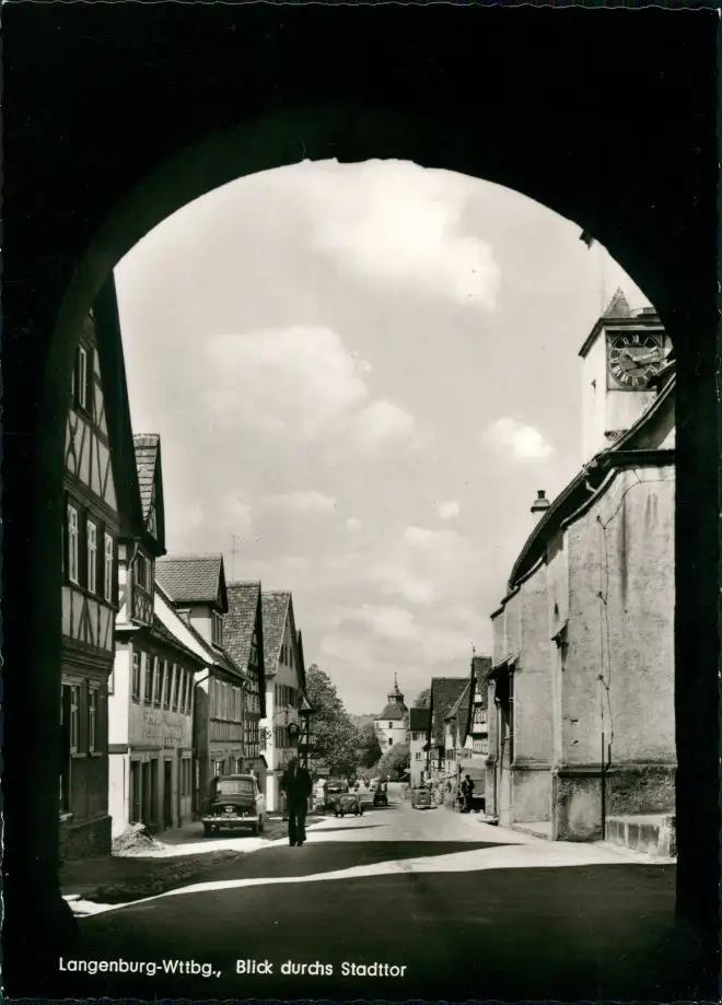 Langenburg Blick durchs Stadttor Strassen Partie, Geschäfte, Autos 1960