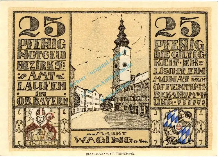 Laufen , Notgeld 25 Pfennig Schein in unc-kfr. Ti.3925.05.040 , Bayern o.D. Verkehrsausgabe