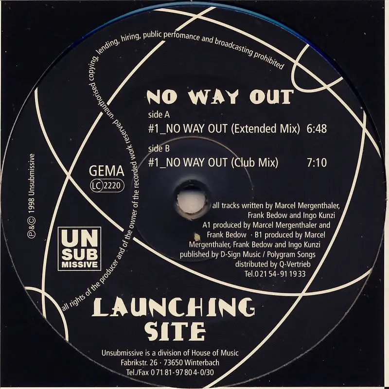 12" Maxi Launching Site - No Way Out, Einheitscover der Plattenfirma, Zustand Platte M- Hülle VG+; Made in Germany 1998 Unsubmissive USM-016-6, Tracks Ext. Mix 6:48, Club Mix 7:10