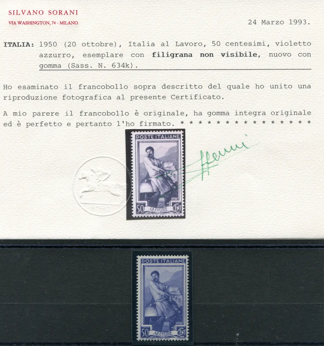 Lavoro Cent. 50 mit nicht sichtbarem Wasserzeichen Vollgummi MNH - Arbeit Cent. 50 n. 634a schönes Exemplar mit nicht sichtbarem Wasserzeichen (ohne Wasserzeichen) - Ungewöhnlich - Zert. Sorani - Kat. euro 450 Cod. 405/15