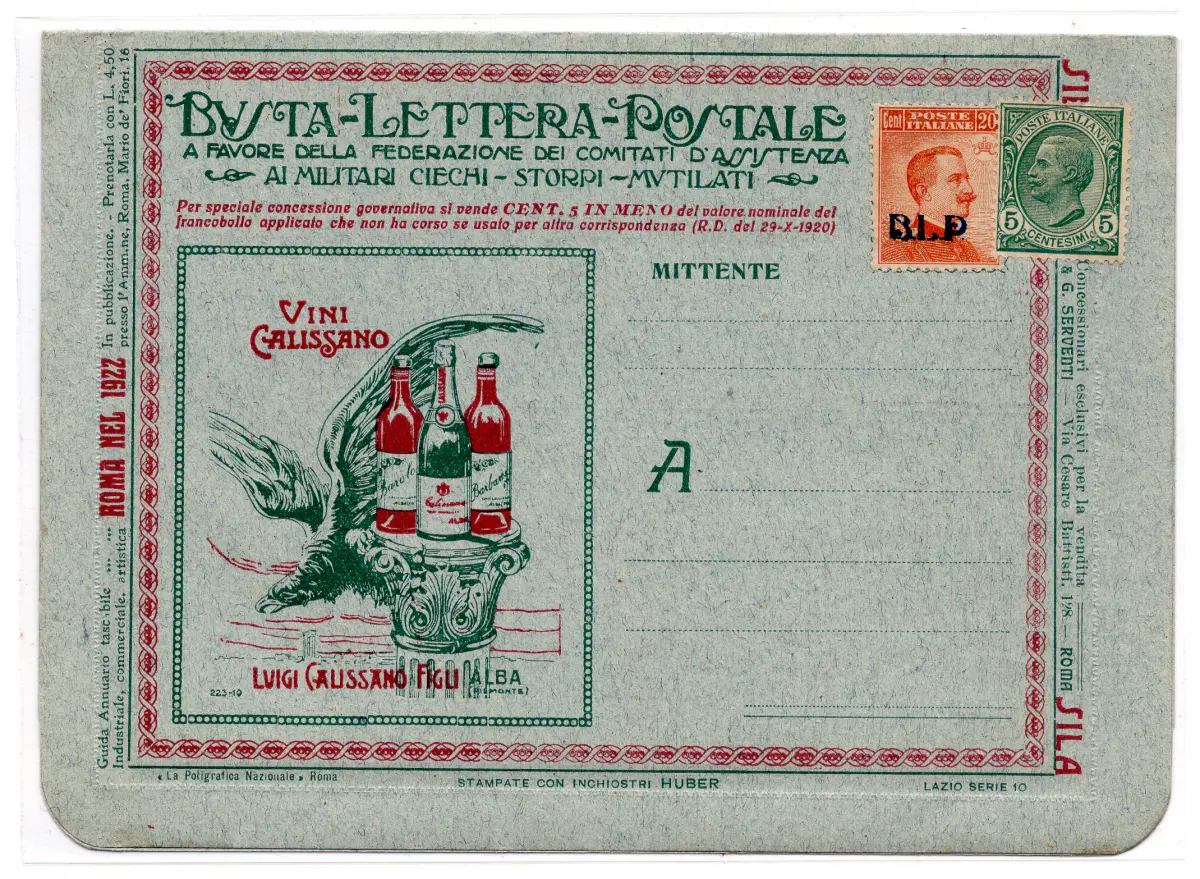 Lazio Serie 10 Weine Calissano - B.L.P frankiert mit Cent. 20 Nr. 2 + komplementäre Cent. 5 Löwen (Nr. 81) nicht gereist, mit Innenfolie - Qualität: wunderschön - ED - Kat. euro 1.100 Cod.261/182