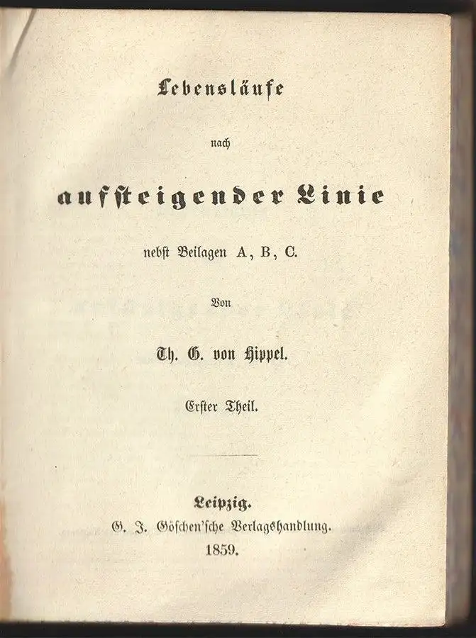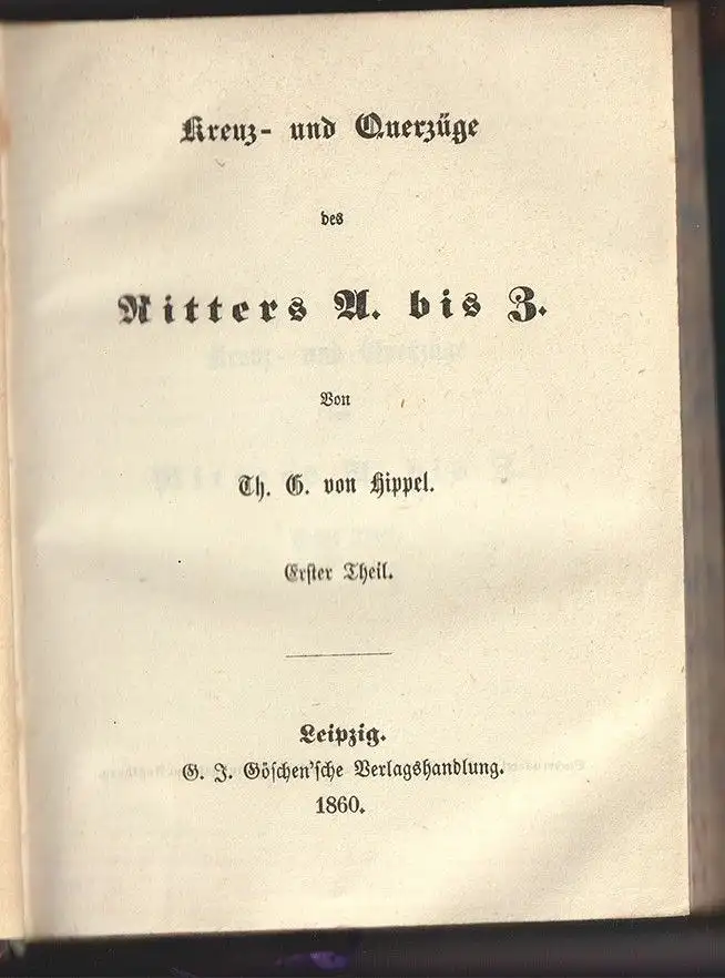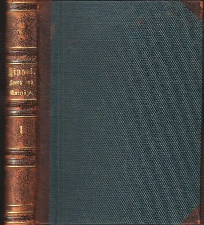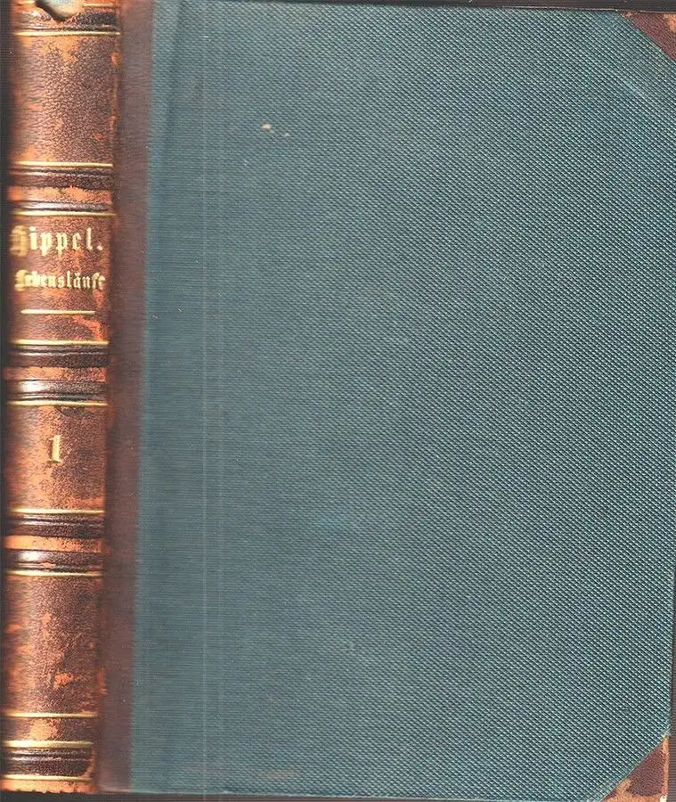 Bemerkungen: Eugen Lennhoff/ Oskar Posner, Internationales Freimaurerlexikon 1932. S. 698; Borst 360 (EA.) - Komplette, dreiteilige Ausgabe des Entwicklungsromans von Theodor Gottlieb Hippel (1741-1796), der erstmals 1778-1781 erschienen ist. Hippel verfasste u. a. 1813 den Kriegsaufruf zu den Befreiungskriegen "An mein Volk". Er trat 1797 der Marienburger Loge "Viktoria zu den drei gekrönten Türmen" bei und war der Freimaurerei zeitlebens eng verbunden, so stiftete er auch zwei Logen in Schlesien. Hippel engagierte sich auch für die Frauenemanzipation, er publizierte 1792 das Werk "Über die bürgerliche Verbesserung der Weiber", wo er sich für die rechtliche Gleichstellung der Frauen einsetzte. - BEILAGE: Ders., Kreuz- und Querzüge des Ritters A. bis Z. 2 Bde. Ebda. 1860. Kl.-8°. 1 Bl., 342; 1 Bl., 327 S. HLdr. d. Zeit mit goldgeprägtem Rückentitel.