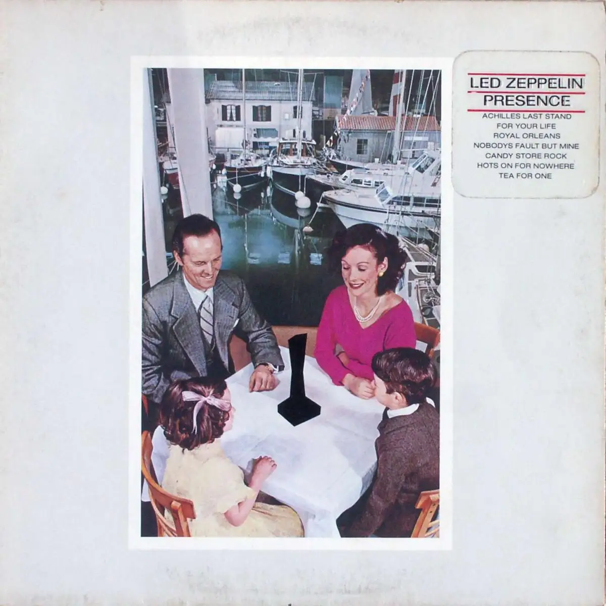 LP Album Led Zeppelin - Presence, Klappcover, Embossed title with Sticker, Price Code (U), no Labelcode; inkl. original Innenhülle, Zustand Platte VG+ Hülle VG+; Made in Germany 1976 Swan Song SSK 59 402, Tracks Achilles Last Stand 10:26, For Your Life 6:21, Royal Orleans 2:58, Nobody's Fault But Mine 6:15, Candy Store Rock 4:10, Hots On For Nowhere 4:42, Tea For One 9:27