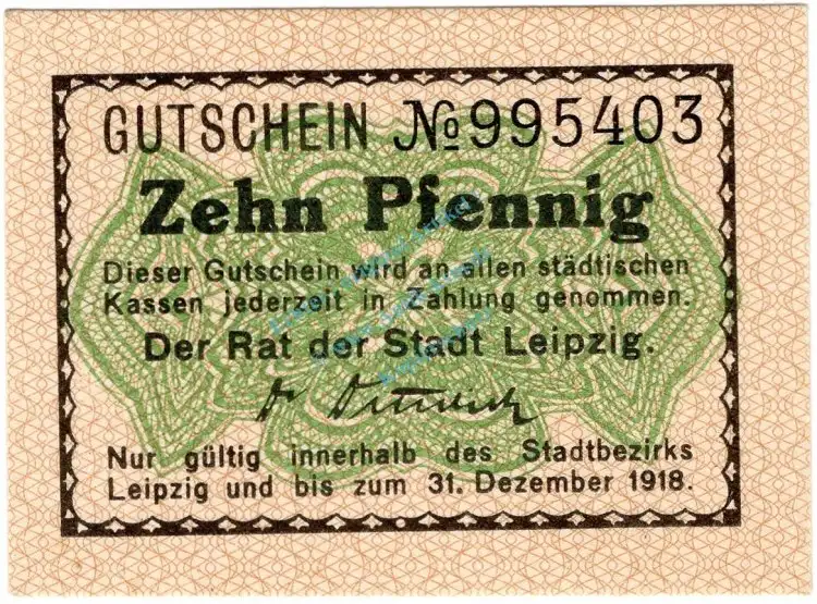 Leipzig , Notgeld 10 Pfennig Schein in unc-kfr. Ti.3980.115.01 , Sachsen o.D. Verkehrsausgabe